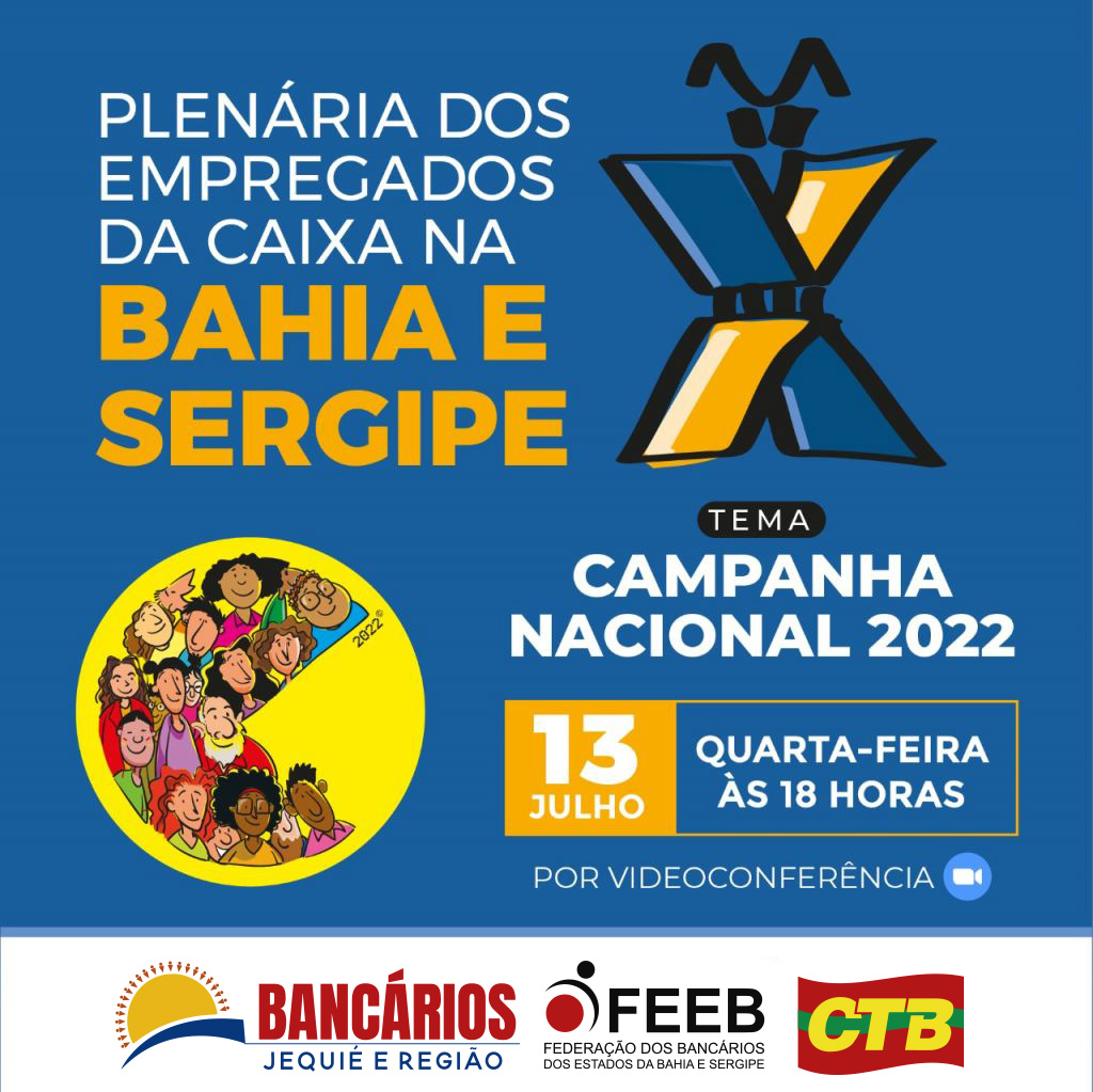 A Federação dos Bancários da Bahia e Sergipe e sindicatos filiados convidam os empregados da Caixa Econômica Federal nos dois estados para uma plenária na próxima quarta-feira (13/7), às 18h, através do Zoom, para discutir a Campanha Nacional 2022 e a Campanha Chega de Assédio. O link para acesso será disponibilizado no dia anterior à reunião.