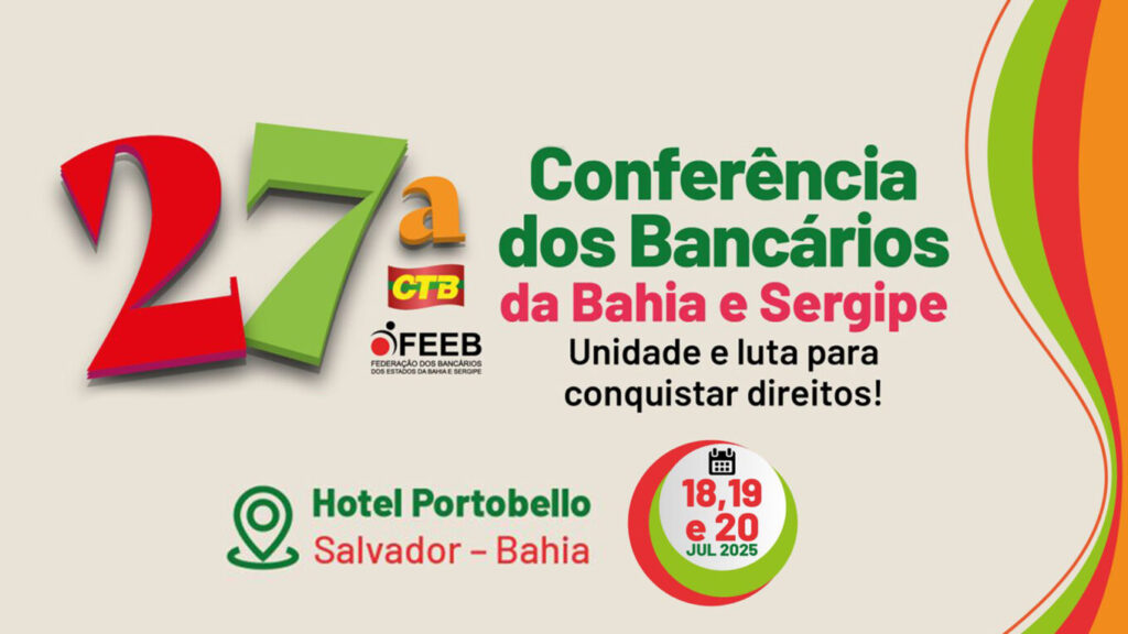 A Federação dos Bancários da Bahia e Sergipe já divulgou a programação da 27ª Conferência, que contará com debates sobre temas importantes, como conjuntura, Sistema Financeiro Global, políticas de juros do BC e Regulamentação do Sistema Financeiro brasileiro; Impacto da Inteligência Artificial no setor bancário e na sociedade; além de saúde e condições.