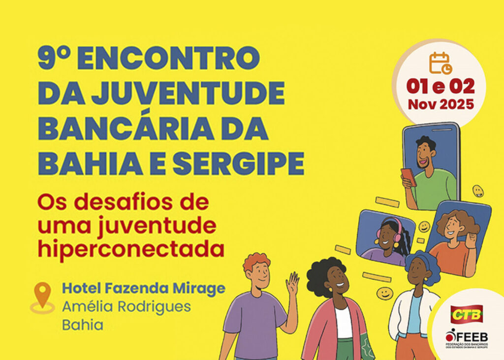 Os sindicatos estão mobilizando os bancários e bancárias de sua base para o 9º Encontro da Juventude Bancária da Bahia e Sergipe, que será realizado nos dias 1º e 2 de novembro, no Hotel Fazenda Mirage, no município de Amélia Rodrigues, na Bahia. Podem participar trabalhadores de até 35 anos interessados em conhecer um pouco mais sobre o funcionamento do movimento sindical.
