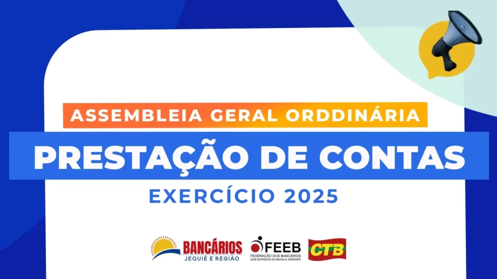O Sindicato dos Bancários de Jequié e Região, inscrito no CNPJ/MF Sob nº 13.243.670/0001-80, Registro sindical nº 911.006.085.01944-7 por seu presidente abaixo assinado, Fabiano Nascimento Miranda no uso de suas atribuições e em conformidade com o Capítulo III, Seção II artigo 17º, § 1º do estatuto da entidade, convoca todos os bancários SÓCIOS que estejam quites com seus deveres financeiros e sindicais da base territorial deste sindicato, para ASSEMBLÉIA ORDINÁRIA a ser realizada no dia 27 de Janeiro de 2026 as 18:00h em 1ª (primeira) Convocação 2ª (segunda) e última Convocação as 19:00h na forma PRESENCIAL  na sede da entidade, sito a Rua Antônio Soares Pereira, 155, Bairro Jequiezinho, Em frente à Justiça Federal “Alto da Prefeitura”, CEP 45.208-413, Jequié Bahia. A fim de deliberarem sobre a seguinte ordem do dia: